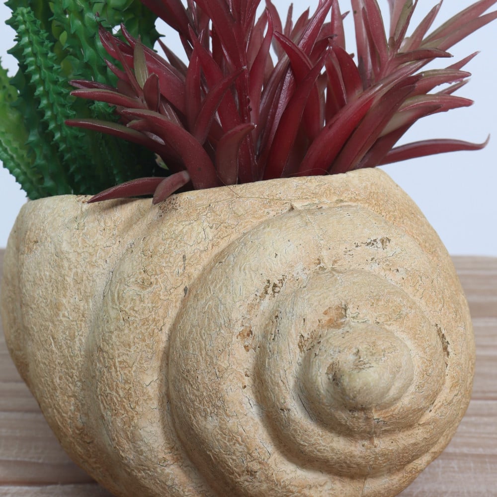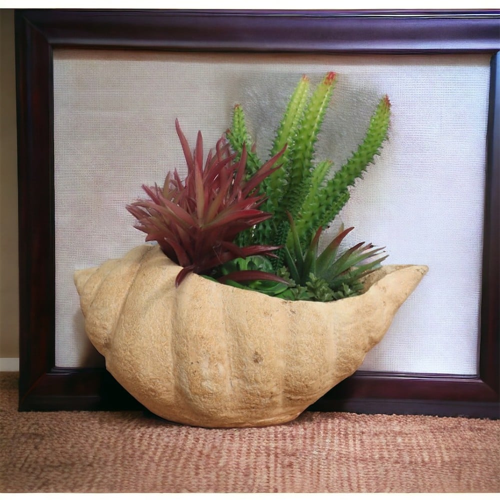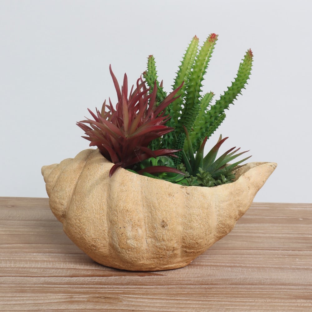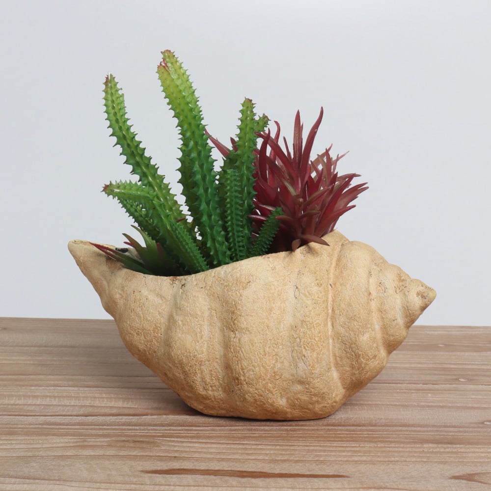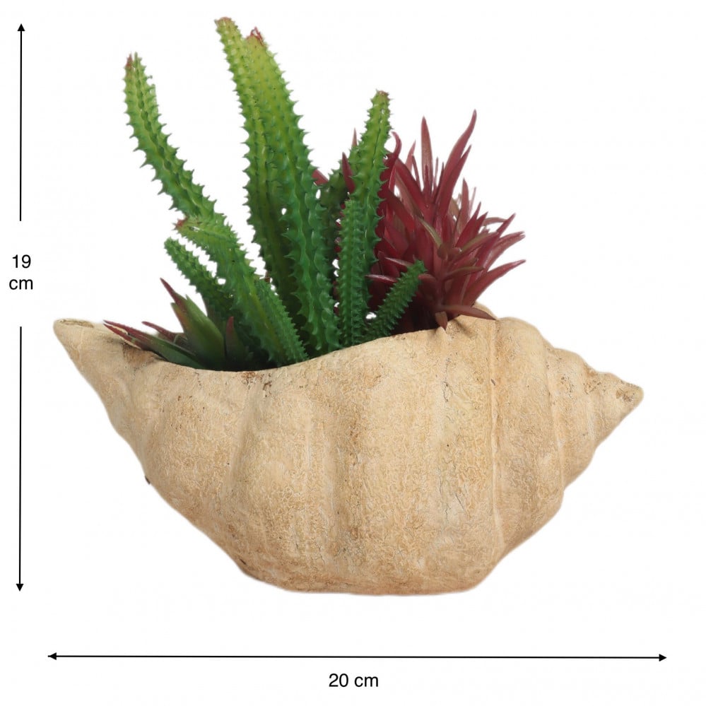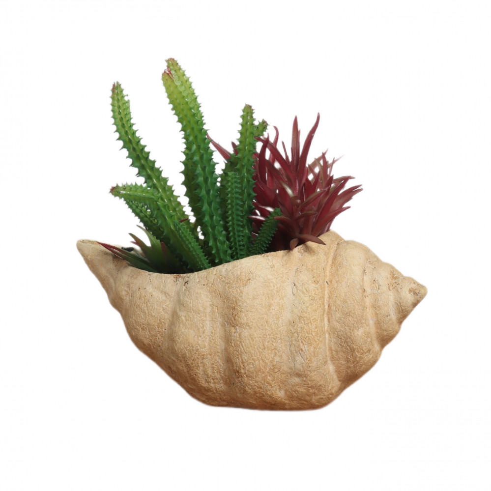 مجموعه صبارات صناعيه متنوعه في إناء شكل قوقعه.