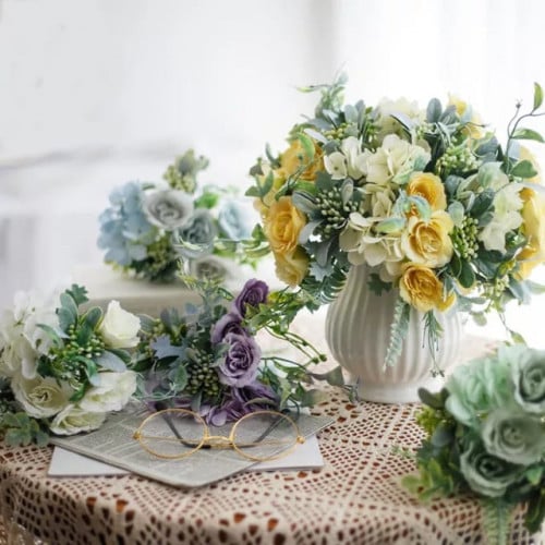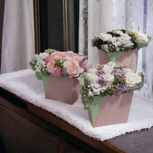 مجموعه صبارات صناعيه متنوعه في إناء شكل قوقعه.