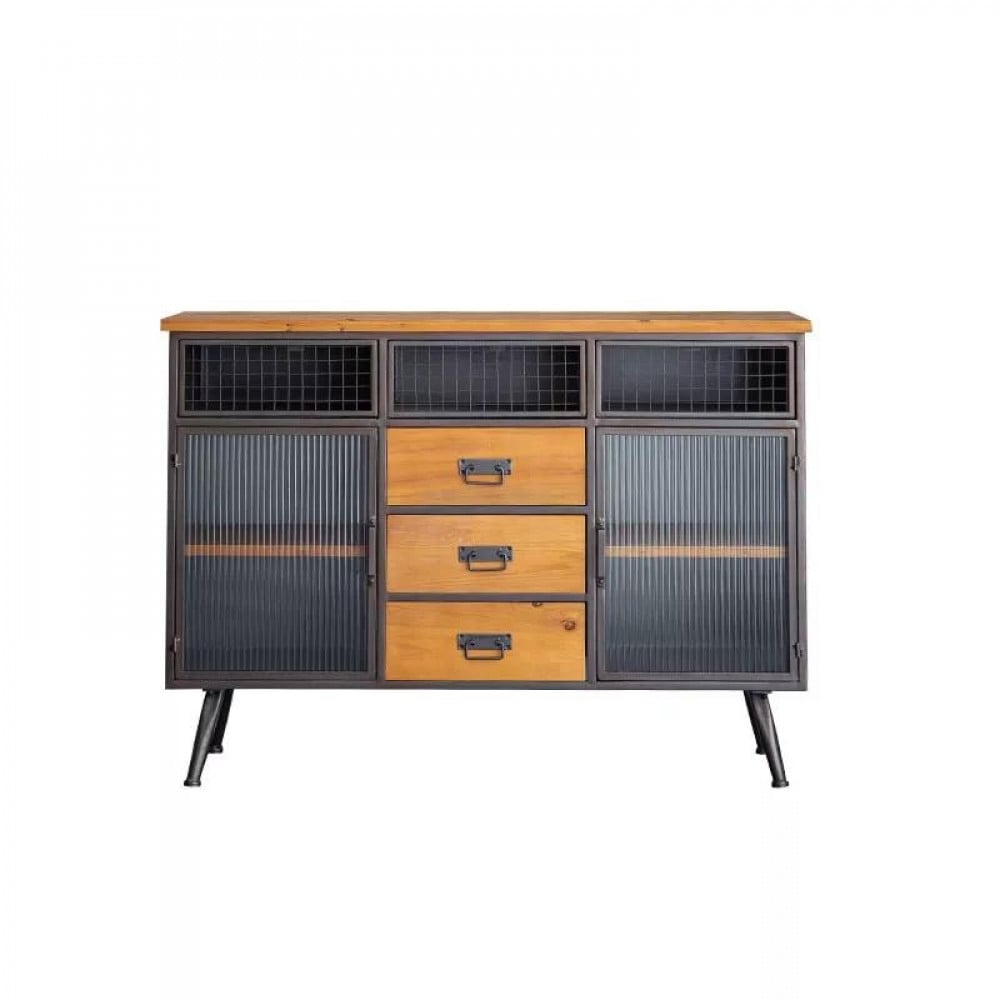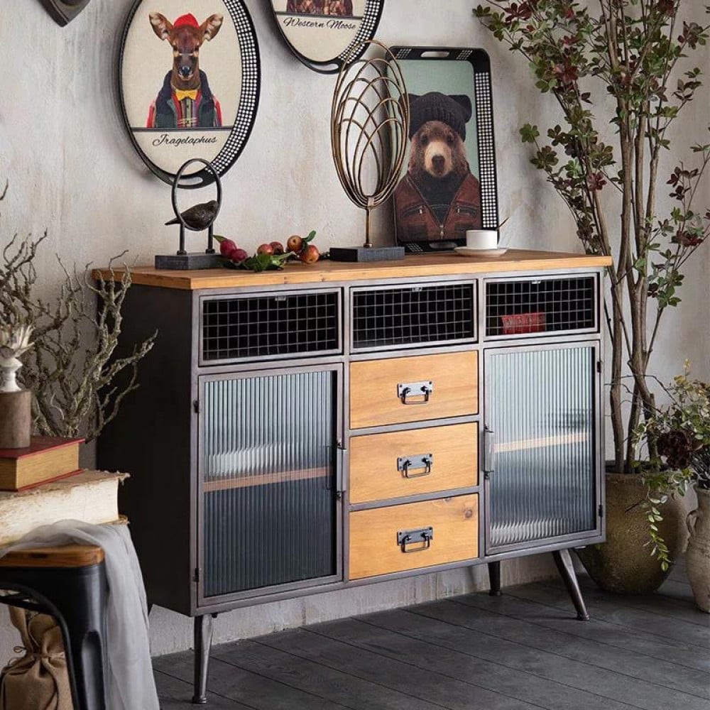 طاوله من الحديد بأدراج خشب طبيعي و زجاج مثلج يواكب الديكورات الحديثه تستخدم لركن القهوه وغيرها.